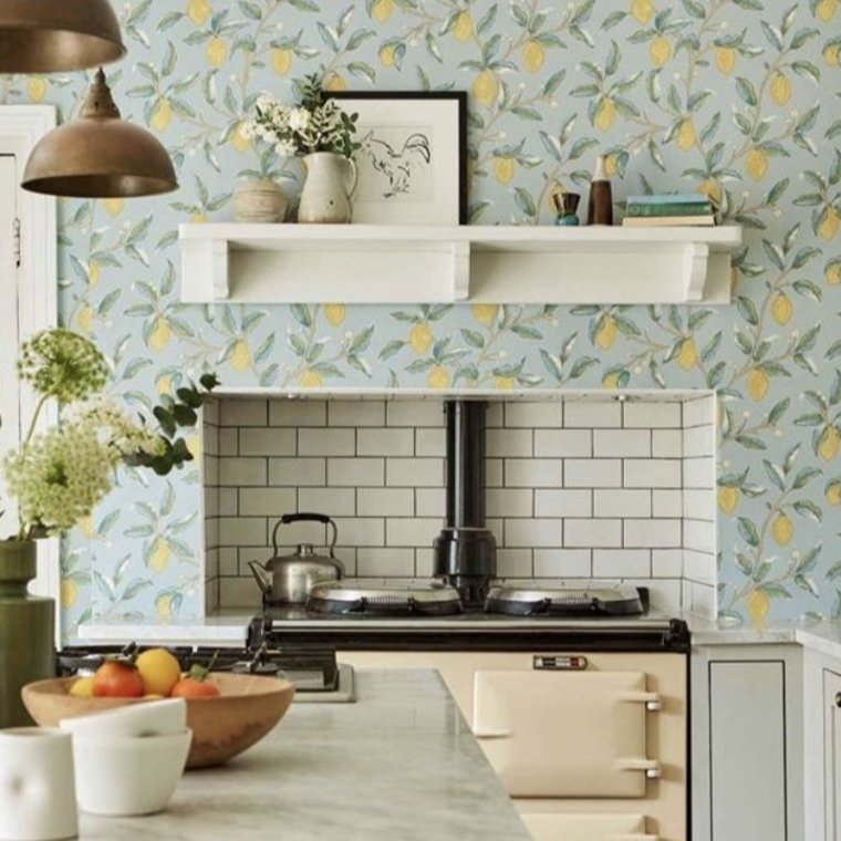 A lovely pattern of vibrant, speckled lemons and meandering leafy branches, shown here in soft shades of yellow and wedgwood blue.
