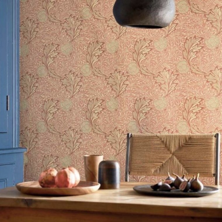 A charming pattern of speckled apples and swirling acanthus leaves, shown here in soft shades of pink and gold.