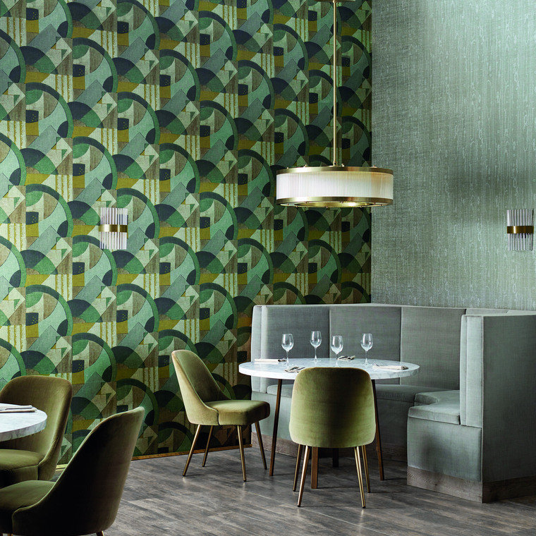 Embrace the unique modernist style of abstract art with this striking geometric wallpaper, shown here in a rich green shading palette.