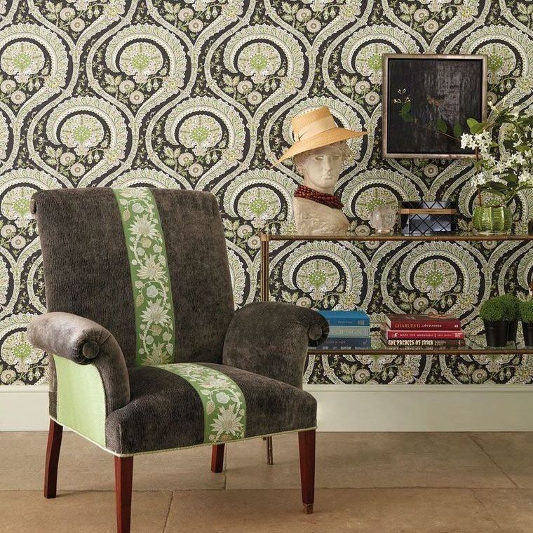 A stylish paisley design comprising meandering trails of textured flowers and leaves with a distinctly Indian vibe, available in this black and green colourway.