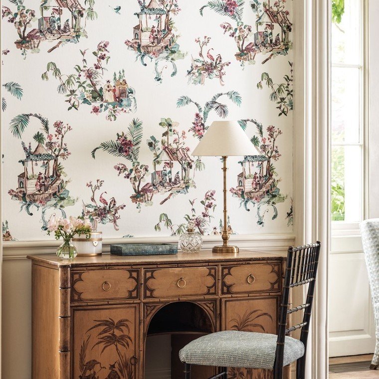 The Toile Chinoise design from Nina Campbell brings sophistication to any interior. Designed with non-woven backing, paste-the-wall application for easy hanging, and washable finish. Each roll is 52 cm wide, 131 cm repeat, offset match.