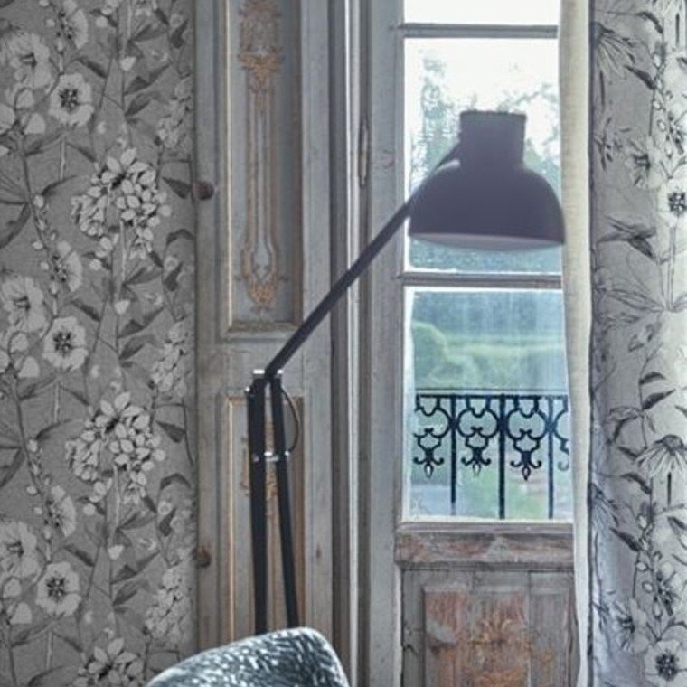 A gorgeous gathering of gracefully sketched flowers and foliage set against a quirky, geometric background, available in this refreshing emerald green shading palette.