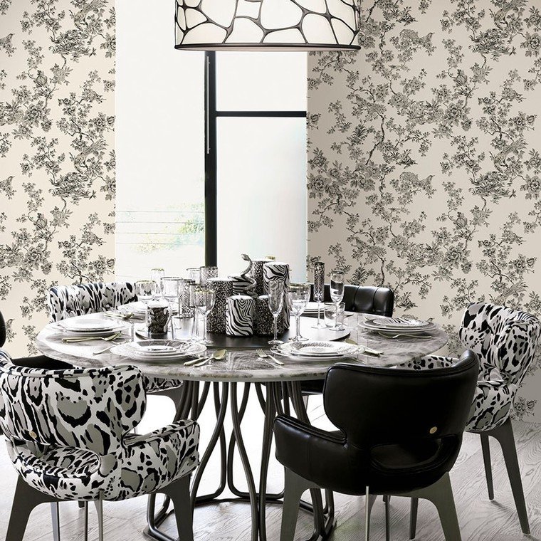 This luxurious wallpaper is part of Roberto Cavalli's Home No 8 collection. Crafted with vinyl on non-woven backing, paste-the-wall application for easy hanging, scrubbable finish, and strippable for easy removal. Each roll is 106 cm wide, 70 cm repeat, straight match.