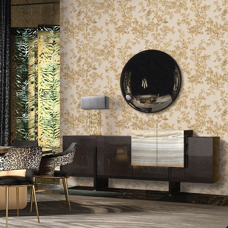 The Roberto Cavalli Home No 8 collection features this elegant designer wallpaper. Designed with vinyl on non-woven backing, paste-the-wall application for easy hanging, scrubbable finish, and strippable for easy removal. Each roll is 106 cm wide, 70 cm repeat, straight match.