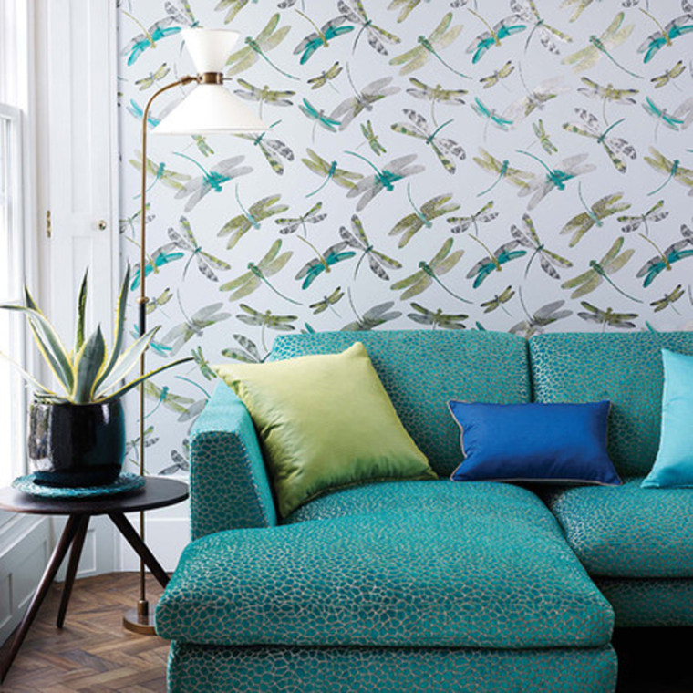 Part of the Matthew Williamson collection, Dragonfly Dance presents Persian, Blue, Soft Jade and Metallic Silver in an elegant designer wallpaper. Crafted with washable finish and strippable for easy removal. Each roll is 52 cm wide, 68.5 cm repeat, straight match.