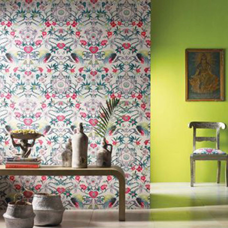 Menagerie by Matthew Williamson features Cerise-Teal tones in a luxurious designer wallpaper. This wallpaper features non-woven backing, paste-the-wall application for easy hanging, washable finish, and strippable for easy removal. Each roll is 68.5 cm wide, 76 cm repeat, straight match.