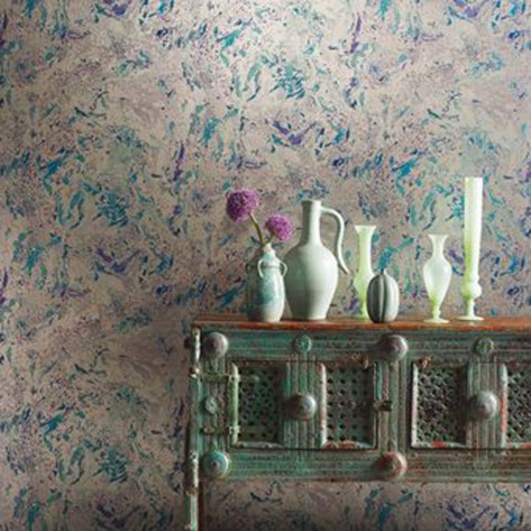 The Makrana design from Matthew Williamson showcases Saffron-Turquoise colorways in a premium wallpaper. Designed with non-woven backing, paste-the-wall application for easy hanging, washable finish, and strippable for easy removal. Each roll is 52 cm wide, 76 cm repeat, offset match.
