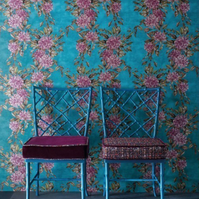 Rhodora Plum-Sepia-Teal by Osborne & Little features Plum-Sepia-Teal tones in a luxurious designer wallpaper. This wallpaper features paste-the-wall application for easy hanging and washable finish. Each roll is 52 cm wide, 61 cm repeat, straight match.
