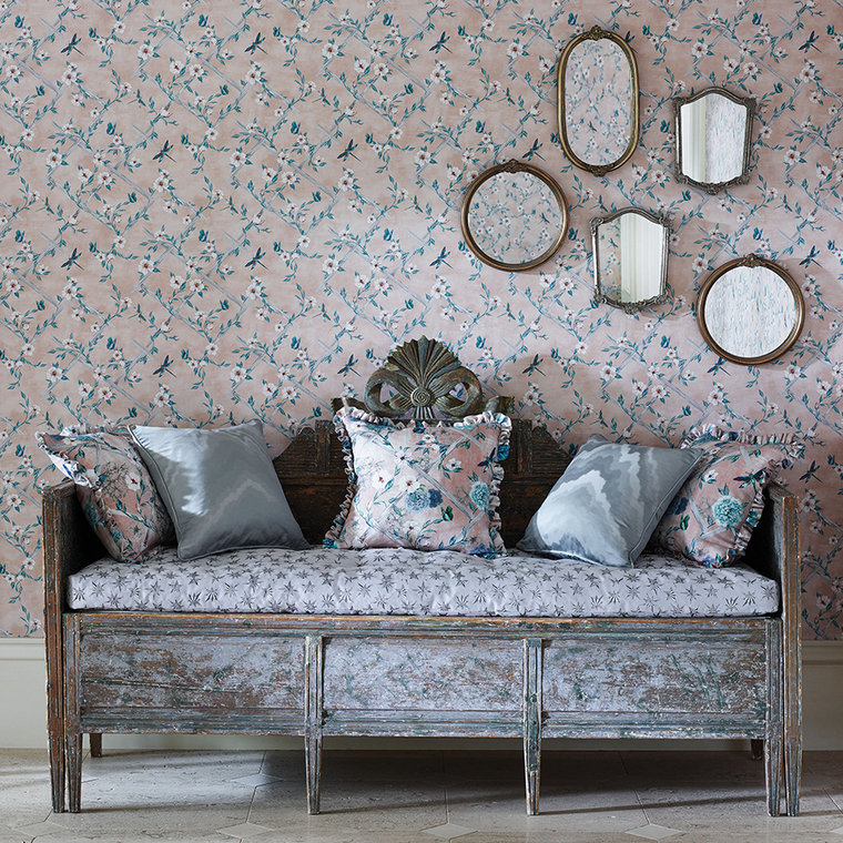 Flourishes of kiwi-white toned wild roses, butterflies, dragonflies laid against the grey mid-scale painterly trellis on a white-pale grey background. Rosanna Trellis design would look as amazing in a contemporary city interior just as well in a traditional country house.
