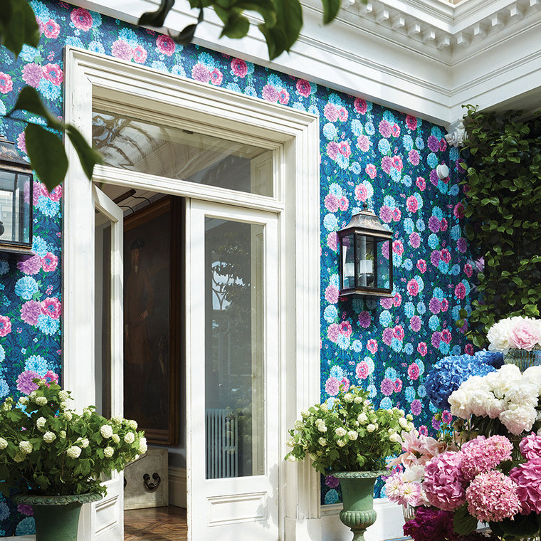 Your interiors are emphasized by a natural touch of fresh inspirations decor with this bouquet of vibrant blush-violet dahlias and peonies on an ice lace-like damask background creating an impression of a lush English garden vista.