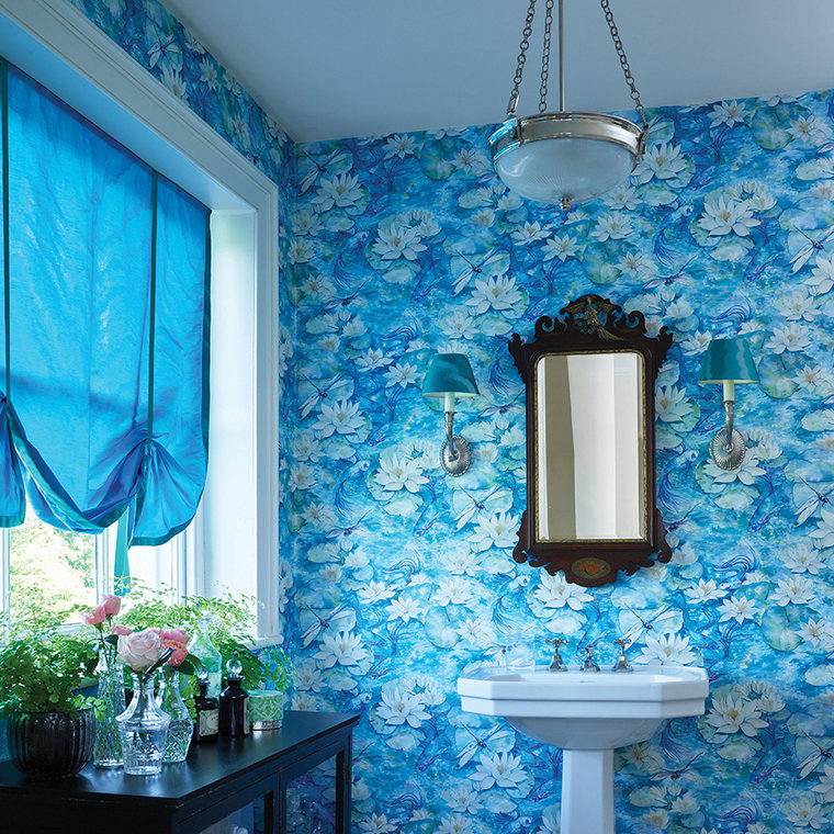 An ornate fantastical design featuring a pond with water lilies, ornamental carp and dragonflies, Water Lily adds dimension and artistic flair with a delicate composition as painted appearance and watercolours including jade, burgundy or lilac.