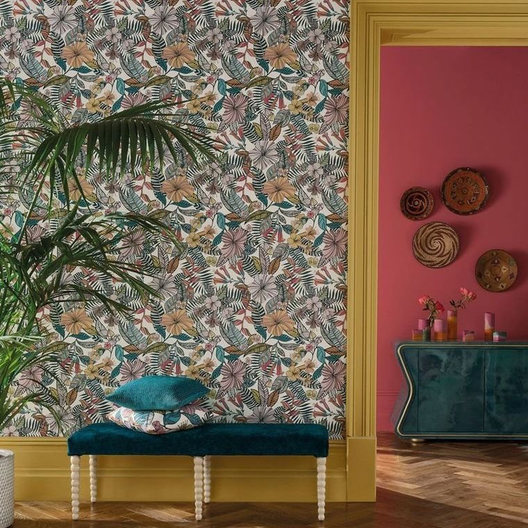 Add a touch of tropical flavour to your walls with this vibrant array of colourful flowers and striped leaves, shown here in lovely shades of ivory, sea blue and pebble.