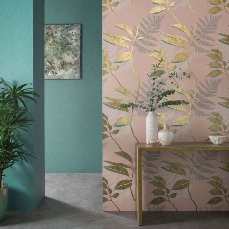A glorious trail of glimmering golden leaves writhe elegantly over a rich chocolate brown backdrop of fern silhouettes in this stunning wallpaper.