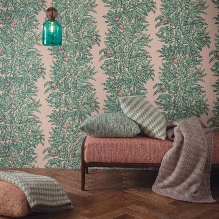 A vertical stripe pattern wallpaper comprising decorative fruit-filled medlar trees, available here in a soft blue colourway.